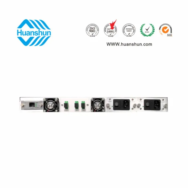 EDFA | YGF1518T-C | 主波-5 ~ +10 d Bm輸入,插播按需求功率配置,合波放大標(biāo)稱規(guī)格(18、19、20、21)輸出,并支持上調(diào)+0.5dB,下調(diào)-3dB,NF ≤ 5dB(0dBm時(shí));1U標(biāo)準(zhǔn)機(jī)箱,雙模塊熱插撥電源,AC90 ~ 255V或DC-48V供電,RJ45標(biāo)準(zhǔn)網(wǎng)管(支持SNMP、WEB) |