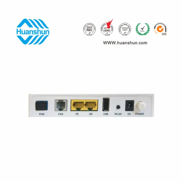 GPON ONU WIFI | HSO2002GVUW | GPON 1GE WIFI ONU, PON端口接入,帶光纖存儲設置,1VOIP+1USB端口,2*2內置天線2.4GHz 300Mbps;外置90~255V-12V 1A電源適配器 |
