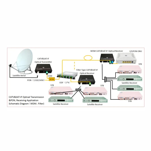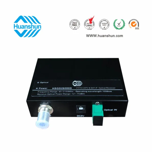 HSGS26082系列CATV&SAT-IF光接收機是一款FTTH型CATV+SAT IF高性能光傳輸設備,適用于有線電視和衛(wèi)星直播電視同網(wǎng)傳輸。本機選用高帶寬、高靈敏度光電管和低噪聲匹配電路,全鉮化鎵IC放大,光接收范圍-15~+2dBm,光控AGC-8~0dBm/RF80dBuv恒定輸出。為方便用戶使用,本機還在面板上設有工作電源和光功率接收監(jiān)測LED指示燈。HSGS2608D為濾波型CATV&SAT-IF光接收機,它工作于1540~1565nm波長,在1 纖3波(1550/1490/1310nm)中可獨立接收1550段CATV&SAT-IF光信號。