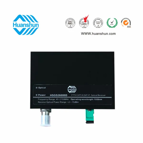 濾波型CATV&SAT-IF光接收機 | HSGS26080D | RF工作帶寬45~2150MHz,光工作波長1540~1565nm,光接收功率-8~0dBm/RF CATV80dBuv,SAT-IF65-75dBuv,RF接口F型公制或英制(訂貨時說明),光輸入接口SC/APC |